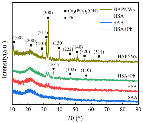 XRD analyses of HAPNWS, HSA, SAA, and HSA + Pb.