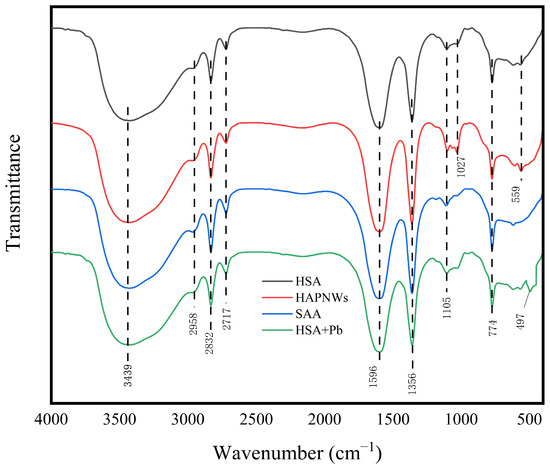 In the infrared spectrum of SAA (Figure 5), the broad peaks at 3439 cm−1 corresponded to hydroxy –OH stretching vibration; the 2958 and 2832 cm−1 peaks belonged to the C–H antisymmetric stretching vibration and symmetric stretching vibration peaks in the methylene group, respectively; the 1596 cm−1 peak corresponded to the stretching vibration of C=O in the carboxyl group; and a bifold frequency peak appeared at 2717 cm−1 [31]. The peak at 1356 cm−1 was the C–H bending vibration peak in the saturated hydrocarbon group; the peak at 1105 cm−1 was the C–O stretching vibration peak; the peak at 774 cm−1 was the C–H out-of-plane rocking vibration in the long-chain hydrocarbon group on the ring. In the infrared spectrum for HAPNW, the wide broad at 3439 cm−1 corresponded to the hydroxy –OH stretching vibration. The positions of the other characteristic peaks remain unchanged, but a new characteristic peak appeared at 1027 cm−1, which was attributed to the stretching vibration of P–O in the phosphate group; the peak at 559 cm−1 was caused by the bending vibration of O–P–O in HA and is the characteristic peak of HAPNWs [32]. The HSA sample was a mixture of two materials, and the infrared spectrum did not change significantly before and after mixing; no new characteristic peaks appeared, and the expansion vibration peak of P–O in the phosphate group at 1027 cm−1 was retained, indicating that SA with the addition of HAPNWs was successfully synthesized. The absorption peaks of HAPNWs at 565 and 604 cm−1 corresponded to the deformation vibration of PO43−, and the absorption peak at 1033 cm−1 corresponded to the stretching vibration of POPO43−; meanwhile, the obvious PO43− vibration peaks of HSA also appeared near 564, 603, and 1034 cm−1, indicating that HAPNWs were effectively embedded in the material. After the adsorption of Pb by HSA, a new characteristic peak appeared at 497 cm−1, which was attributed to the bending vibration peak of Pb–O, indicating that the hydroxyl group in HSA was coordinated with Pb and that a coordination reaction occurred [33].