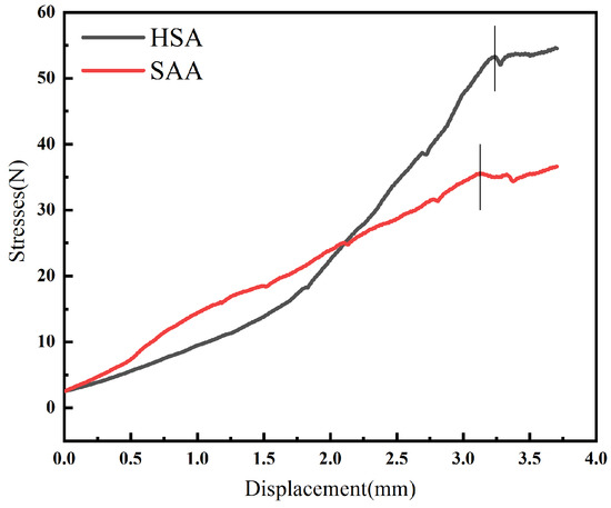 The compressive capacities of SAA and HSA were tested using a universal testing machine to evaluate their mechanical strength. In the stress test (Figure 6), the peak stress–strain curve of HSA was relatively smooth at the beginning, and the compressive resistance of HSA was not as good as that of SAA. When the strain was 2.2 mm, the stresses of both reached the same value of 25 N, and there was a slight oscillation near the peak strength. After compression by 3.128 mm, SAA fracture occurred under a pressure of 35.574 N and reached the peak value. The HSA was compressed by 3.238 mm at 53.293 N before breaking and reaching its peak value. Its pressure resistance was 1.498 times that of SAA, and the pressure curve showed that HSA was more ductile than SAA while resisting pressure. According to the material cross section shown in Figure 2c, the internal structure of HSA was denser and more compact than that of SAA, indicating that HAPNWs provide mechanical strength, and play a role in supporting and connecting as a ductile skeleton.