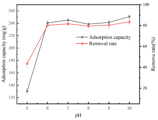 The initial pH of the solution affects the form of Pb and charge on the surface of the adsorbent and is one of the important parameters affecting Pb removal. As shown in Figure 7, Pb was mainly present in the form of Pb2+, Pb(OH)+, Pb(OH)2, Pb(OH)3−, and Pb(OH)42−, when simulated at different pH conditions (pH range was 5–10; analyzed using the Visula MINTEQ 3.1 software); when pH < 10, Pb was mainly present in the form of Pb2+. A 20 mL Pb(NO3)2 solution with an initial mass concentration of 300 mg/L was added to each of the five conical flasks to adjust the pH of the solution, 0.2 g of HSA was added, and the solutions were placed in a rotary constant-temperature gas-bath oscillator for 48 h at 25 °C and 150 r/min. The concentration of the Pb before and after adsorption was determined and the adsorption amount of HSA was calculated.