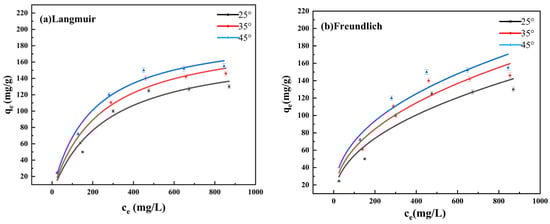 The adsorption amount of HSA also increased with increasing temperature, but decreased at 45 °C, likely because of changes in the physical and chemical properties of the HSA. Isothermal adsorption characterization was used to determine the adsorption process and thermodynamic equilibrium relationship between Pb2+ and HSA under constant temperature conditions, as well as to explore the mechanism and capacity of HSA to adsorb Pb2+. The Langmuir and Freundlich models were used to fit the experimental data; isothermally fitted curves of the adsorption of Pb2+ by HSA (Langmuir and Freundlich) are shown in Figure 9a,b, and the parameters in the adsorption isotherm fitting are listed in Table 1. The fitting results for the Langmuir model exhibited superior R2 values, indicating that the entire adsorption process is based on monolayer adsorption on a uniform surface [36].