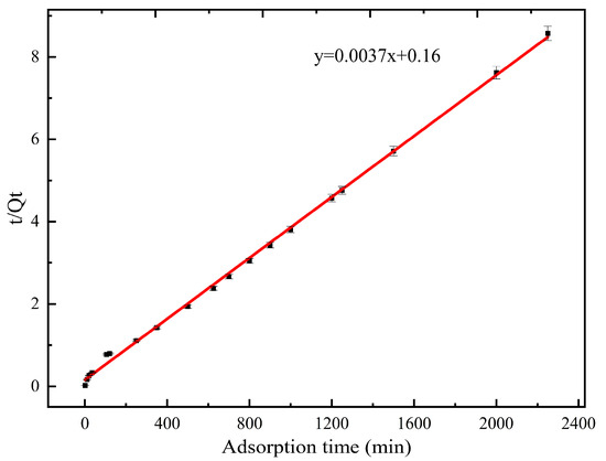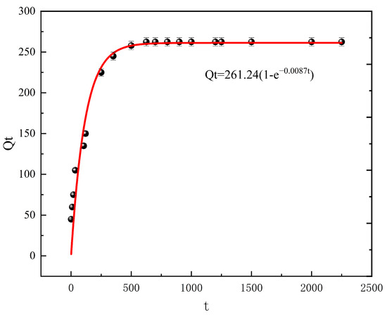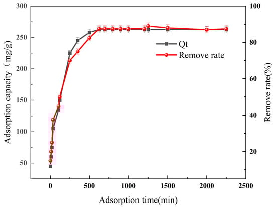 In each of the 19 conical flasks, we combined 20 mL of Pb2+ solution (initial mass concentration of 300 mg/L and pH = 6) with 0.3 g of HSA powder. The concentration of Pb2+ after adsorption was determined by ICP–OES after 1, 10, 20, 35, 105, 120, 250, 350, 500, 625, 700, 800, 900, 1000, 1200, 1250, 1500, 2000, and 2250 min (Figure 10). The adsorption amount of HSA gradually increased with increasing adsorption time. Between 1 and 500 min, the adsorption amount increased rapidly from 30.53 to 258.36 mg/g, and there were a large number of effective adsorption active sites on the surface of the HSA. There was a large difference between the concentration of Pb2+ on the surface of HSA and that in solution, and so the mass transfer power was strong. Between 500 and 2250 min, the adsorbed amount increased slowly and reached saturation at 625 min [37]. Thus, the number of active sites in the adsorbent bound to Pb2+ decreased.