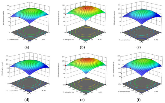 Figure 13a–c shows the response surface and contour projections of the effects of temperature and pH on the adsorption amount of HSA. The curvature of the surface formed by the effect of temperature and pH on the adsorption amount of HSA varied; when adsorption time was constant, the adsorption amount of HSA increased and then decreased with increasing pH. The response surface was steeper in the temperature direction, indicating that the effect of temperature was greater than that of pH. The HSA adsorption amount was higher for an adsorption time of 1000 min compared with that for adsorption times of 500 and 1500 min. Figure 13d–f shows the response surfaces of the effect of adsorption time and pH on the adsorption amount of HSA as well as the contour projection plots. When the pH was constant, the adsorption amount Q increased and then decreased with increasing adsorption time. The response surface changed gently in the direction of pH, indicating that the effect of adsorption time was greater than that of pH. The adsorption amount of HSA at an adsorption temperature of 35 °C was higher than that at adsorption temperatures of 25 °C and 45 °C. Figure 13g–i shows the response surface as well as the contour projection of the effect of adsorption time and temperature together on the HSA adsorption amount. For a constant temperature, with increasing adsorption time, HSA adsorption first increased and then decreased. In summary, both adsorption time and temperature had significant effects on HSA adsorption, while the amount of HSA adsorbed was higher at pH 7 than it was at pH 6 or pH 8.
