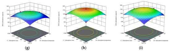 Effects of different factor interaction conditions on the adsorption of Pb2+ by HSA. (a) Adsorption time = 500 min; (b) adsorption time = 1000 min; (c) adsorption time = 1500 min; (d) T = 25 °C; (e) T = 35 °C; (f) T = 45 °C; (g) pH = 6; (h) pH = 7; (i) pH = 8.
