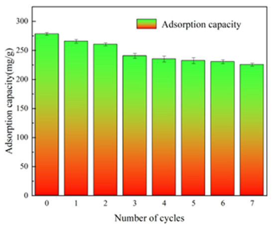 The influence curve of HSA adsorbent recycling times on adsorption capacity is shown in Figure 14. With the increase of recycling times of HSA materials, the adsorption capacity of HSA for Pb2+ gradually decreased. After seven times of reuse, the adsorption capacity of 0.3 g HSA for Pb2+ decreased from 278.4 mg/g to 225.5 mg/g. This is because the adsorbed Pb2+ cannot be completely washed out in the washing process, but the retention rate of adsorption capacity is still maintained at 81%, indicating that HSA adsorbent has good reusability.