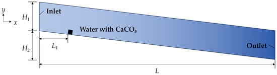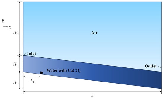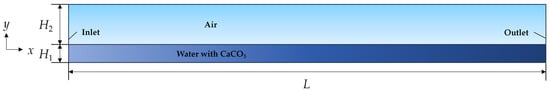 This section of the calculation employs a horizontal flow method, utilizing the source water from the colorful pond in the Huanglong Scenic Area. Since this calculation focuses on the boundary layer formed between the flowing Huanglong water source and the bottom channel, the model can be simplified to a 2D plane. The inlet flow velocity is set at 1 m/s, with a water height of 30 mm (H1). Above the flow field is air (H2 = 70 mm), with the fluid entering from the left side and exiting on the right. The computational domain is shown in Figure 1, measuring 1000 mm in length (L). The total number of grid elements is 65,000, and the minimum height of the mesh is 1 mm in the H1. The density of water is 998.2 kg/m3, and its viscosity is 0.001003 kg/(m·s); the density of calcium carbonate is 2800 kg/m3, with a viscosity of 1.75 × 10⁻5 kg/(m·s), and the particle diameter is 5 × 10⁻6 m, with a concentration of 1%.