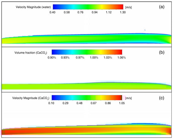 From Figure 2a, it can be observed that after the water flows in from the left inlet, the flow height increases compared to the initial 30 mm due to the presence of air above it. At the bottom, the water flow velocity is zero, resulting in the formation of a flow boundary layer. As the flow develops, the boundary layer begins to thicken on the right side. According to the simulation calculations, the maximum concentration of calcium carbonate reaches 1.06%, which is an increase of 6% compared to the inlet.