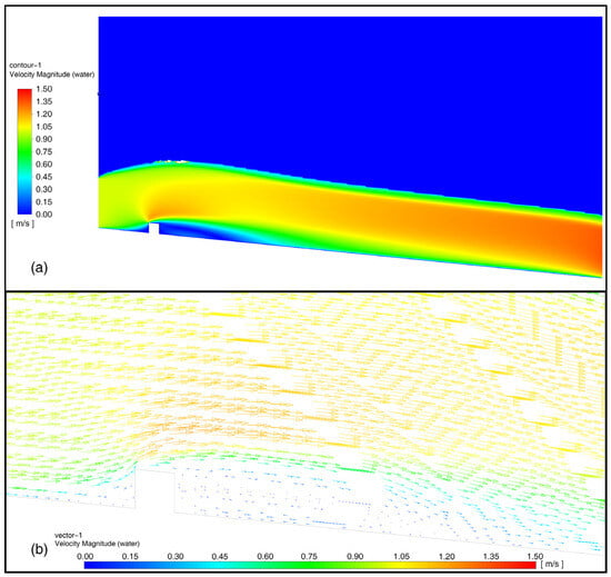 Figure 4 displays the velocity contour map and velocity vector diagram of the water flow under the inclined flow field condition.