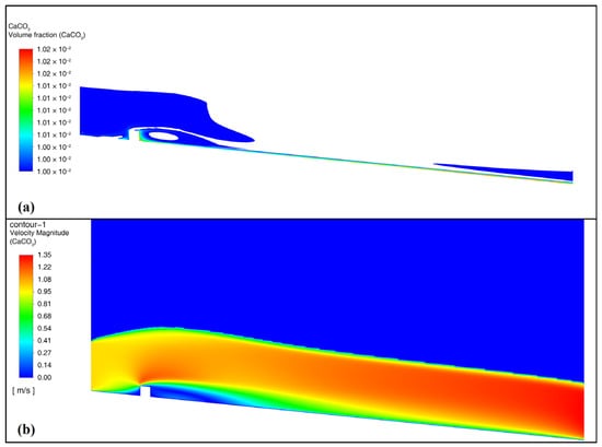 By adjusting the display range to only observe areas where the concentration of calcium carbonate particles is greater than or equal to 1%, Figure 5a shows that there is a significant increase in calcium carbonate concentration at the bottom right side of the water flow and behind the baffle. Comparing this with Figure 4a, it can be noted that these locations correspond to areas of reduced flow velocity, where calcium carbonate particles accumulate and settle in the low-velocity zones.