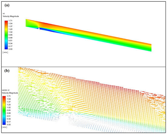 Velocity distribution of inclined plane flow field: (a) velocity cloud image, (b) velocity vector image.