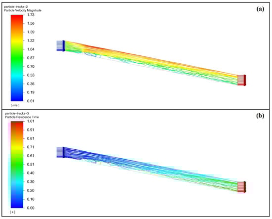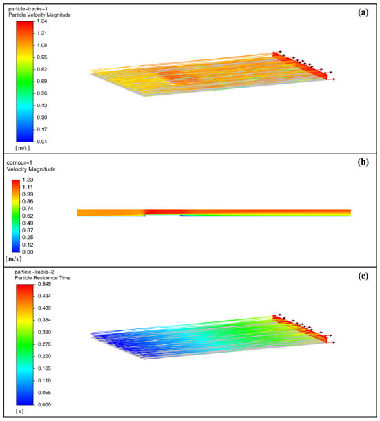 In comparison, between Figure 13a,b it can be observed that the velocity of the particles is influenced by the velocity of the fluid at their location; that is, the faster the fluid velocity, the faster the particle velocity, and vice versa. As the particle velocity decreases, there is a higher likelihood of deposition occurring. The color adjustments represent the residence time of the particles, as shown in Figure 13c. If the particles do not experience deceleration, the time taken to pass through the channel is 0.40 s, while most of the particles leaving the channel have a residence time ranging between 0.38 and 0.43 s.