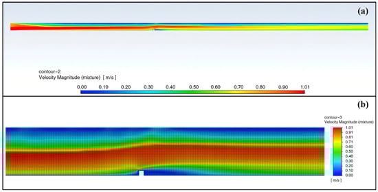 From Figure 7a, it can be seen that the maximum water flow velocity is 1.708 m/s, represented in deep red, while the minimum velocity is 0 m/s, distributed around the front and rear of the baffle and along the wall at the bottom of the flow channel. As shown in Figure 7b, when the water flows in from the left side and encounters the baffle, it begins to flow around it, creating a low-speed vortex zone behind the baffle, as well as forming another stable boundary layer at the bottom right. Based on the calculations from previous conditions, it can be predicted that calcium carbonate particles will accumulate in the low-speed vortex zone behind the baffle and at the bottom right.