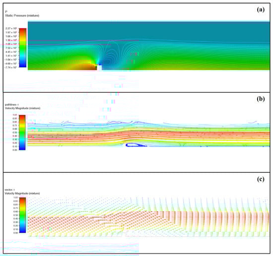 Water–air flow: (a) pressure distribution cloud, (b) flow line, (c) velocity vector.