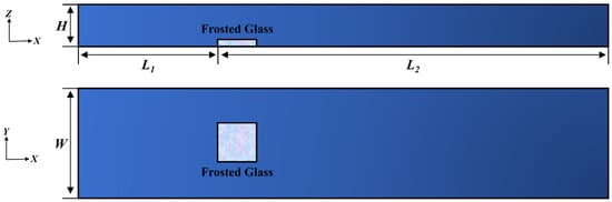 Figure 12 shows the structure of the particle sedimentation measurement section used in this simulation. The total length of the channel L(L1 + L2) is 400 mm, with a width W of 150 mm and a water flow height H of 10 mm. A piece of frosted glass is placed centrally in the channel, measuring 5 × 5 × 2 mm, positioned 100 mm from the inlet (distance L1). The direction of the water flow is along the positive x-axis. This model is employed to observe the motion trajectories of calcium carbonate micro-particles in the flow field. The total structured grid count is 535,400, and the minimum height of the mesh is 0.5 mm in the H1.