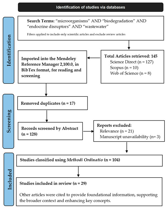 For this systematic literature review, a bibliographic search was conducted in three databases: Science Direct, Scopus, and Web of Science (Figure 1). Combinations of descriptors and Boolean operators were used to identify publications relevant to this research. The search employed combinations of the terms “microorganisms” AND “biodegradation” AND “endocrine disruptors” AND “wastewater”, with filters applied to include only scientific articles and exclude review articles. A total of 145 results were obtained: 127 from Science Direct, 10 from Scopus, and 8 from Web of Science. Following the database search, the articles were downloaded in BibTex format and imported into the Mendeley Reference Manager 2100.0 for reading and screening. The screening process was conducted within the Mendeley software, version 1.19.8, by removing duplicate articles (n = 17) and reviewing the abstracts of the remaining 128 articles. Based on the review, articles were selected or excluded based on their relevance to the research objectives (n = 21), with manuscript unavailability (n = 3) resulting in 104 retained for further analysis. These remaining articles were then classified using the Methodi Ordinatio approach to systematic literature reviews, which helps assess their scientific relevance for the systematic literature review. The method for excluding articles based on relevance employs the InOrdinatio equation, which considers three key factors in a scientific article: the impact factor (IF), the year of search (YR = 2024), the year of publication (YP), and the number of citations (nCis) [23].