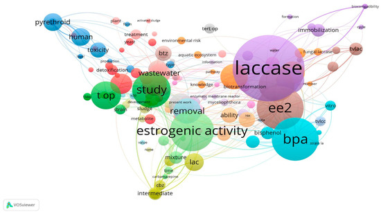 The size of the nodes corresponds to their frequency in the literature, reflecting their relative importance within the field. As illustrated in Figure 2, the term “laccase” emerged as a central focus, i.e., it presents with a larger node in the lexical network which indicates a higher frequency of occurrence of the keyword, reflecting its significant role in the bioremediation of EDs, particularly in wastewater treatments. The strong association between the term “lac” (laccase) and “estrogenic activity”, as well as the terms “laccase”, “EE2” (17α-ethinylestradiol), and “BPA”, underscores the enzyme’s central role in addressing this class of pollutants. Additionally, the frequent occurrence of terms such as “BPA” and “EE2” highlights their prevalence and the concern of the research community about these compounds, and further emphasizes their status as high-priority pollutants due to their potent endocrine-disrupting effects. It is also linked to several key concepts, including “removal”, and “biotransformation”, which highlights the enzyme’s critical role in the elimination of pollutants from the environment. The concept of “biotransformation” reflects the enzyme’s ability to convert hazardous pollutants into less toxic substances, enhancing its relevance in environmental remediation strategies. Additionally, laccase is connected to “wastewater”, emphasizing its application in the treatment of water contaminated by various pollutants. This analysis emphasizes the key role of laccase and the focus on specific EDs in the current research on fungal bioremediation, which led to the inclusion of a dedicated section in this article to further exploring the role of these enzymes in the degradation of EDs.