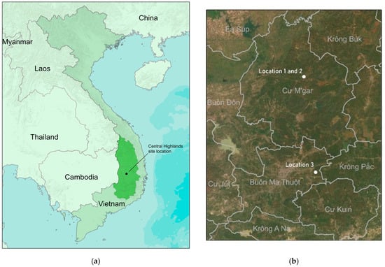 (a) Location of Dak Lak Province in the Central Highlands of Vietnam and (b) the locations of the study sites in Dak Lak province in the Cu M’Gar and Buon Ma Thuot districts. Locations 1 and 2 were near Cu M’Gar, located at selected farms (farmer sites), and Location 3 was at a research station near Buon Ma Thuot.