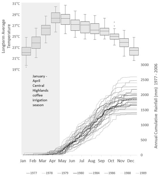 Long-term average monthly temperature (box and whisker) and accumulated annual rainfall (witches’ hair plot) for Buon Ma Thuot (1977–2002). Each grey line indicates one year of accumulated rainfall data from January to December. The dotted line is the median accumulated rainfall. The grey section to the left is the typical irrigation season from January to April. This period is characterized by temperatures increasing to a peak in April, and by minimal accumulated rainfall (mean < 100 mm) during the period.