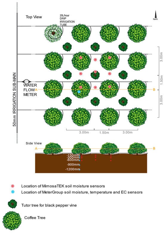 Systematic view of irrigation and soil water measurement instrumentation. Plant spacing between coffee trees is typically 3 m × 3 m. An opportunity or shade tree may be planted interspersed between the coffee at offset 3 m × 3 m spacing. The red targets show the location of the low-cost MimosaTEK sensors in an intensive grid pattern on the northern side of the tree line. The Meter Group sensors were installed near the southwest-most MimosaTEK sensor at the same depths to compare the sensing systems.
