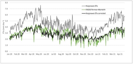 Figure 4 shows the daily values of ETo (mm day−1) calculated using the Hargreaves equation (grey) and the corrected Hargreaves (black), overlaying the FAO56 PM (green) daily values. Figure 4 indicates that the corrected Hargreaves tends to underpredict on days with low FAO56 PM ETo, however, these underestimates are typically outside the irrigation season (January–April).