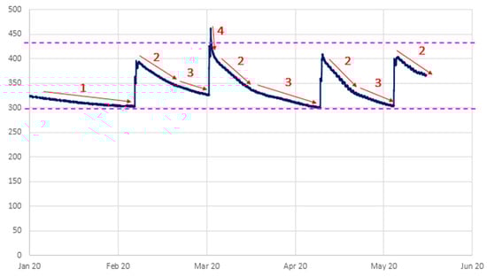Figure 5 illustrates volumetric soil moisture at Site 1 in Cu M’Gar. Label 1 shows a slow daily decline in soil moisture through winter when there is lower evapotranspiration, i.e., the coffee plant is in a semi-dormant state. Dormancy is broken by either the first irrigation or rainfall of the season, with increased crop water use (label 2) following, as the crop is actively transpiring under a “no-stress” condition. There is adequate, but not excessive, moisture available in the root zone.