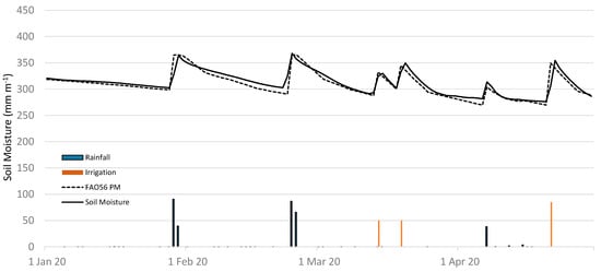 The FAO56 Penman–Monteith model (Figure 4) was calibrated against actual soil moisture at three sites and is taken as the reference water balance model. Irrigation was triggered with a refill point of 30% volumetric water content [21] and filled to field capacity with an application efficiency of 90%. Scenarios 2–10 used the same irrigation rules (Table 3).