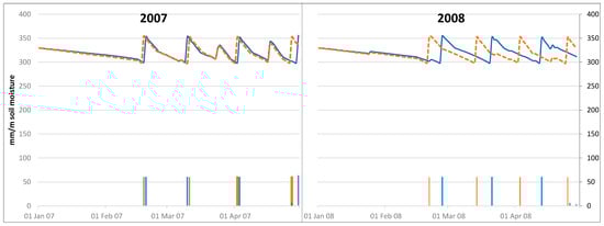 Soil moisture traces estimated using FAO56 P-M (blue trace and bars) and LDM (orange dotted trace and bars) for historic data sets from the 2007 and 2008 irrigation seasons. The timing and volume of rainfall events impact the performance of the LDM.