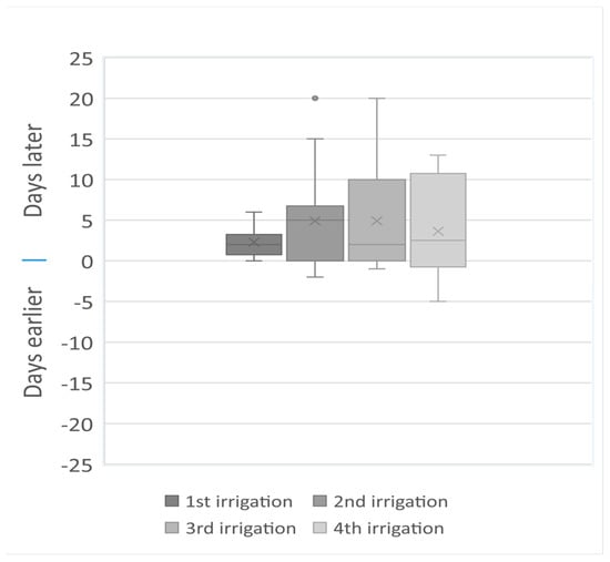 Differences in timing of irrigation recommendation using Low Data Model compared to FAO56 (PM model). Blue bars indicate a 7-day window before and after irrigation dates as modelled using PM FAO56. Dot above the whisker in the 2nd irrigation is an outlier.