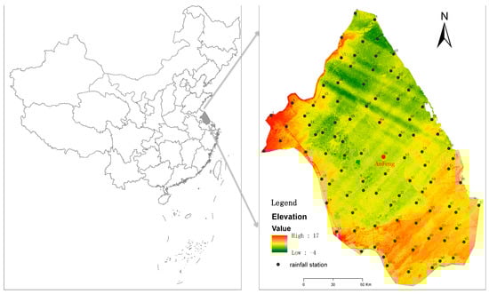 The daily rainfall data from 95 stations spanning a 7-year period, from 2006 to 2012, were compiled as shown in Figure 1. This figure illustrates the spatial distribution of these stations, all of which are automatic weather stations. These stations provided consistent and high-frequency rainfall measurements throughout the study period. The data were sourced from the Jiangsu Province Hydrology and Water Resources Investigation Bureau and encompass a region primarily situated between the Yangtze River and the Old-Yellow River in Jiangsu Province, eastern China. The total area covered is approximately 31,800 km2, with a station density of 2.99 per 1000 km2. The majority of this area is part of the lower reaches of the Huaihe River and the coastal region of the Yellow Sea, characterized by an intricate network of rivers and low-lying terrain. A smaller portion in the south belongs to the Lower Yangtze. Climatologically, the region falls within the monsoon zone, influenced by the Mongolian cold high pressure in winter and the East Asian summer monsoon in summer [21,22]. The area experiences distinct seasons: a dry and windy spring, a hot and rainy summer, a pleasant and moist autumn, and a cold and dry winter. The average annual rainfall across the 95 stations is 1022.8 mm, with a standard deviation of 77.5 mm. Rainfall is predominantly concentrated in summer and early autumn (from June to September), accounting for an average of 65.7% of the annual total. Some stations record percentages above 70%.
