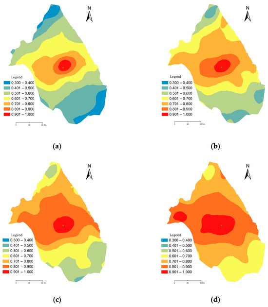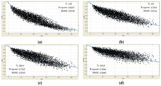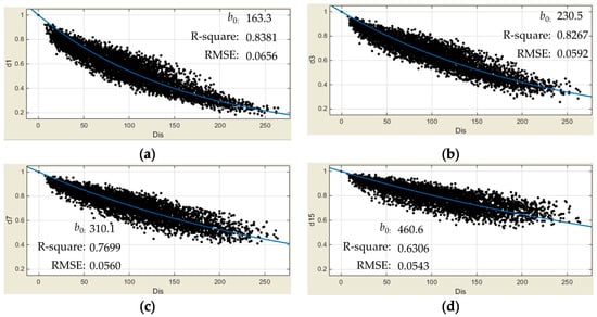 To analyze how the correlation coefficients vary with distance, a modified exponential function was be selected to model the relationship between the correlation coefficients and the distances between stations. This approach has been utilized to capture the distance–decay effect in spatial correlation [25,26]. The modified exponential function, assuming isotropy, can be expressed as follows: