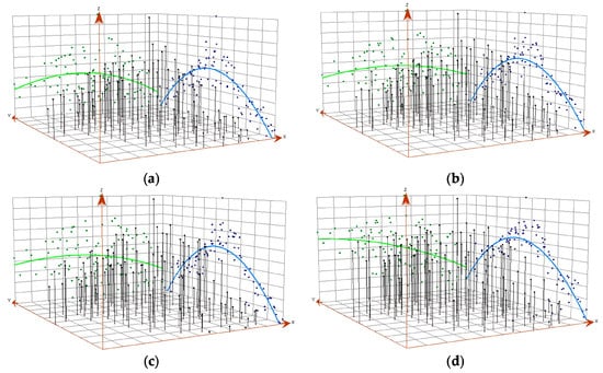 The correlation coefficient (z-axis) trend for time scales of (a) daily, (b) 3 days, (c) 7 days, and (d) 15 days. The x-axis represents the north–south direction, the y-axis represents the east–west direction, and the z-axis shows the correlation coefficient. The blue curve represents the fitted trend projected onto the y-axis, with blue points indicating the projections on the y-axis, while the green curve represents the fitted trend projected onto the x-axis, with green points indicating the projections on the x-axis.