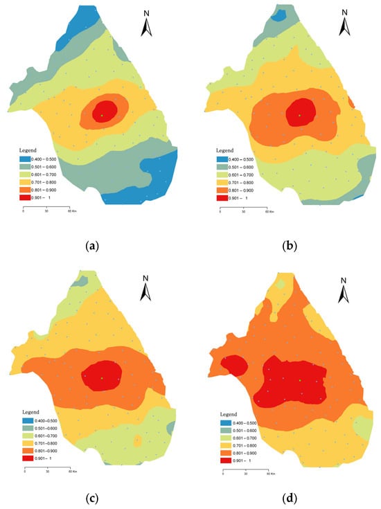 Researchers have preliminarily identified anisotropic characteristics in the distance–decay of the correlation through their analysis. To further investigate this phenomenon, the correlation field was modeled using the ordinary Kriging method within a geostatistical framework. The Kriging method estimates unknown values as a weighted linear combination of nearby data points, with the objective of minimizing the variance in the prediction error while ensuring that the residuals are close to zero [29]. Although the Kriging approach inherently introduces some degree of error, this does not significantly affect the overall trend observed in the correlation field.