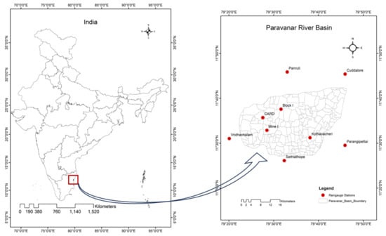 The Paravanar River Basin is located in the Cuddalore District of Tamil Nadu, India. It lies between latitudes 11°18′ and 11°45′ north and longitudes 79°18′ and 79°45′ east, covering a total geographical area of 872.34 square kilometers. It is the second-smallest river basin among the 17 river basins in Tamil Nadu. The Cuddalore District comprises six administrative blocks: Cuddalore, Panruti, Kurinjipadi, Kammapuram, Mel Bhuvanagiri, and Parangipettai. The Paravanar River Basin is bordered by the Bay of Bengal to the east, the Pennaiyar River Basin to the north, and the Vellar River Basin to the south and west. The study area’s location and rain gauge sites are illustrated in Figure 1.