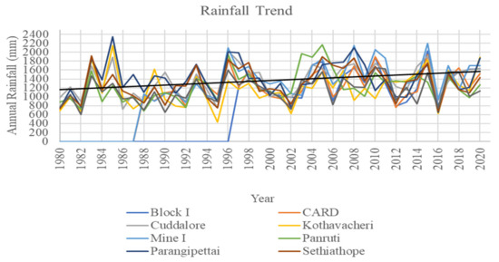 Analyzing rainfall trends is essential for interpreting climate variability, managing water resources, and formulating sustainable agricultural and disaster preparedness plans. Regions with growing rainfall trends may become vulnerable to agricultural vulnerabilities, including waterlogging, soil erosion, and crop damage, whereas areas with decreasing trends confront issues such as drought and water scarcity [56]. Figure 2 illustrates the rainfall trend at nine rain gauge stations, Block I, CARD, Cuddalore, Kothavacheri, Mine I, Panruti, Parangipettai, and Sethiathope, from 1980 to 2020. It underscores considerable variations in yearly precipitation, signifying an inconsistent monsoon pattern affected by climatic variations. Specific years, such as the mid-1980s, late 1990s, and mid-2010s, exhibit significant increases in rainfall, presumably attributable to cyclonic storms or strengthened monsoons, potentially resulting in flooding in vulnerable regions. In contrast, the late 1980s and early 2010s demonstrate markedly reduced rainfall, indicating drought conditions that may affect agricultural and water supply. Regional variations in rainfall trends are visible, with coastal regions such as Cuddalore and Parangipettai likely experiencing increased rainfall due to their closeness to the Bay of Bengal, while interior areas like Panruti exhibit rather steady patterns. The fluctuation in rainfall throughout the course of time and space underscores the necessity for sustainable water management measures, rainwater harvesting and climate-resilient agricultural practices.
