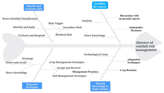 Quantitative risk assessment of climate and physiological controls is vital for sustainable agricultural resource management and achieving high crop yields [23,24]. To measure the study’s impact on farmers, participants are encouraged to conduct a cause-and-effect analysis of heavy rainfall risk management. The identified risks and corresponding response strategies are presented within a cause-and-effect framework, enabling farmers to understand and address these challenges effectively.