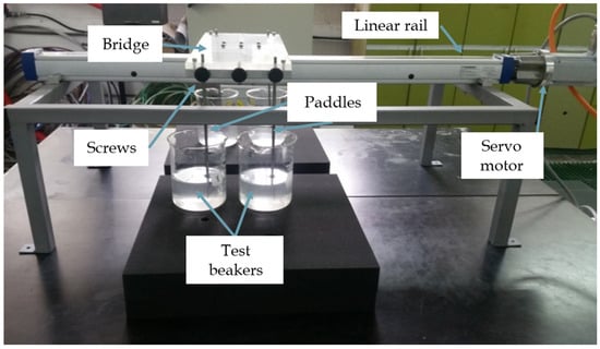A system generating linear sinusoidal oscillatory motion was constructed. The system enabled a wide range of operating frequencies, amplitudes, and running durations. The linear motion system (Figure 1) was composed of a servo motor (AKM32D, Kollmorgen, Brno, Czech Republic) connected to a linear rail and a moving element (forward and backward, M55 Ball Screw Drive, Thompson, Bidford, UK) and equipped with a custom “bridge” with six holes for paddle rods (three on each side). Paddles were fastened to the bridge with screws, enabling the adjustment of their heights. The paddles created an oscillatory motion in the beakers.