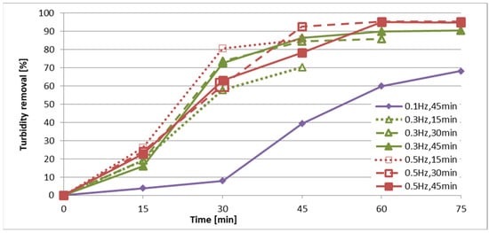 Turbidity removal for the different slow mixing operational conditions was examined for three frequencies (0.1, 0.3, 0.5 Hz) and three mixing durations (15, 30, 45 min), with interactions. Settling for all the experiments remained constant (30 min), therefore the overall duration was 46–76 min, according to the slow mixing time.