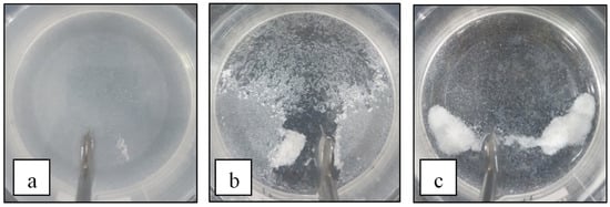 After applying a 0.5 Hz mixing frequency (Figure 3c), the sediments exhibited a distinct “moon-shape” pattern. This was formed due to the vortices created during oscillation (see Section 3.4.3 below). The pattern became less defined as the mixing frequency was lowered (Figure 3a,b). The sedimentation pattern for 0.1 Hz was very undefined and quite uniform since most of the sedimentation occurred when the water was still (no mixing) in this case.