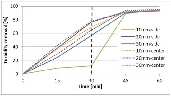 Turbidity removal vs. amplitude–paddle location interactions. Solid lines—side location; dotted lines—center location; XX mm—amplitude; vertical black dashed line—end of oscillation (slow mixing). Settling time in all experiments was 30 min.