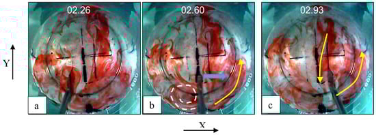 Typical motion pattern in the beaker over half period. White dashed line: main vortex; yellow solid lines: main current direction; blue arrow: paddle direction; (a–c) different times; numbers at top—timing (in seconds).