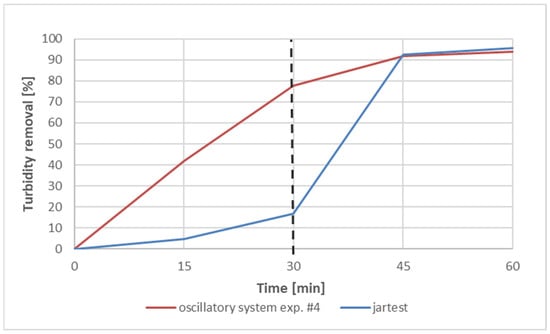 Turbidity removal—Jar test and oscillatory system. Vertical dashed black line—end of slow mixing (mixing and settling time in both experiments were 30 min each).