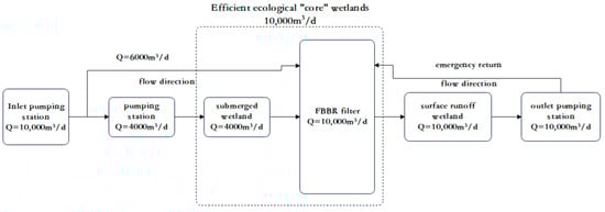 The influent for this project is the effluent from the secondary sedimentation tank of the sewage plant. The effluent from the secondary sedimentation tank of the sewage plant (10,000 m3/d) flows to the integrated intake pumping station. The effluent from the pumping station is divided into two parts: one part (4000 m3/d) is repressurized and conveyed to the upper submerged wetland of the high-efficiency ecological core wetland, and then flows into the lower fixed-bed biofilm reactor (FBBR) filtering tank after being processed by the submerged wetland; the other part (6000 m3/d) is directly conveyed to the lower FBBR filter tank of the high-efficiency ecological “core” wetland. The reason why 40% of the flow is diverted to the submerged wetland is that the submerged wetland is mainly used for phosphorus removal. We have calculated, according to the information in Table 1, that, if the TP in the constructed wetland needs to be reduced from 0.5 mg/L to 0.3 mg/L, a proportion of 40% will be sufficient. Finally, the effluent is upgraded to the existing wastewater plant outfall through an integrated pumping station.