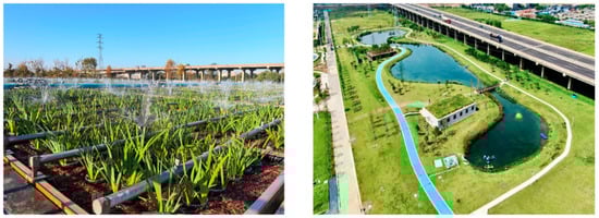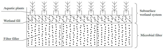 The aquatic plant configuration of the surface-flow wetland mainly includes riparian hydroplants and submerged plants, and the vegetation selection prioritized local species. The aquatic plants with nitrogen- and phosphorus-absorbing capacities are positioned along the slope of the wetland; the bottom of the pavement consists of submerged plants. The submerged plants exhibit desirable traits such as cold-resistance, frost-resistance, and resilience, with the primary choices being hornwort, black algae, and foxtail algae, among others. Since decomposing aquatic plants can release organic substances and nitrogen and phosphorus elements back into the water body, it is essential to regularly harvest these plants to prevent secondary pollution [15,16]. Usually, we harvest plants in autumn and winter, and wait until spring to replant plants with adsorption capacity.