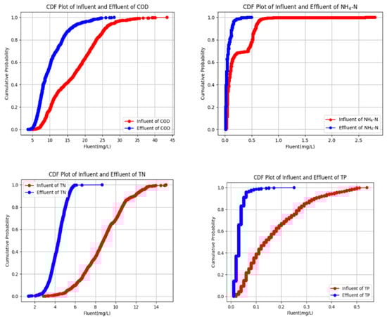 The empirical CDFs of COD, NH4+–N, TN, and TP were plotted (Figure 4), which can be used to visually observe the distribution of the data, including the median, quantile, and degree of data dispersion. After the purification of the effluent by the high-efficiency ecological core wetland and surface flow wetland, it is evident that all pollutants have been effectively removed [18].