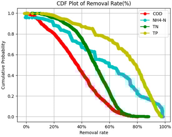 The CDF chart of the removal efficiencies of various indicators is plotted in Figure 5, which visually displays the removal capacity of COD, NH4+–N, TN, and TP in the constructed wetland.