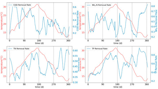 Many aquatic plants are planted in the high-efficiency ecological core wetland. Plants also play a crucial role in purifying pollutants in the surface-flow wetland. Many aquatic and submerged plants are planted here to absorb nitrogen and phosphorus from the water. The temperature directly affects the purification efficiency of plants and microorganisms [24]. For plants, a cold temperature can hinder the growth of aquatic plants and even make them wither, thus reducing their purification ability, which includes nitrogen fixation. In spring and summer, when temperatures are high and the daylight duration is long, plants grow vigorously, and their absorption of inorganic substances significantly increases. Therefore, their purification capacity is stronger in these seasons [25]. The processes of microbial filtering and the use of a FBBR have been widely applied in high-efficiency ecological core wetlands. For microorganisms, the removal efficiency of COD and TN is highest in summer and autumn, while the removal efficiency of TP is highest in winter [26]. Accordingly, the relationship between the temperature and the removal rate of pollutants was investigated in this constructed wetland.