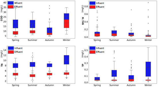 Box plots of the influent and effluent nutrient parameters: COD; NH4+-N; TN; TP (mg/L) per season (autumn, spring, summer, and winter) for the three years of monitoring (2021–2023).