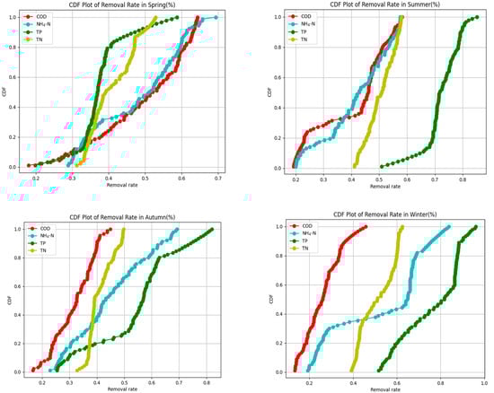 The CDF plots of the removal rates of the different pollutants in the four seasons are shown below (Figure 8).