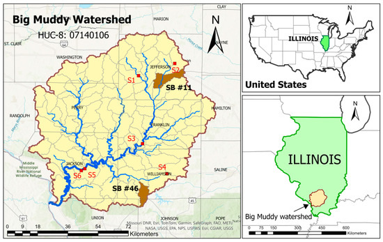(Left) Big Muddy River Watershed (BMW, HUC8: 07140106) showing sub-basin 11 (SB #11) and sub-basin 46 (SB #46) selected for field-scale analysis; (Top Right) Location of Illinois within the United States; (Bottom Right) Location of the BMW in southern Illinois.