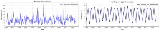 (a) Monthly total precipitation and (b) mean temperature from 2000 to 2021 in the Big Muddy Watershed.